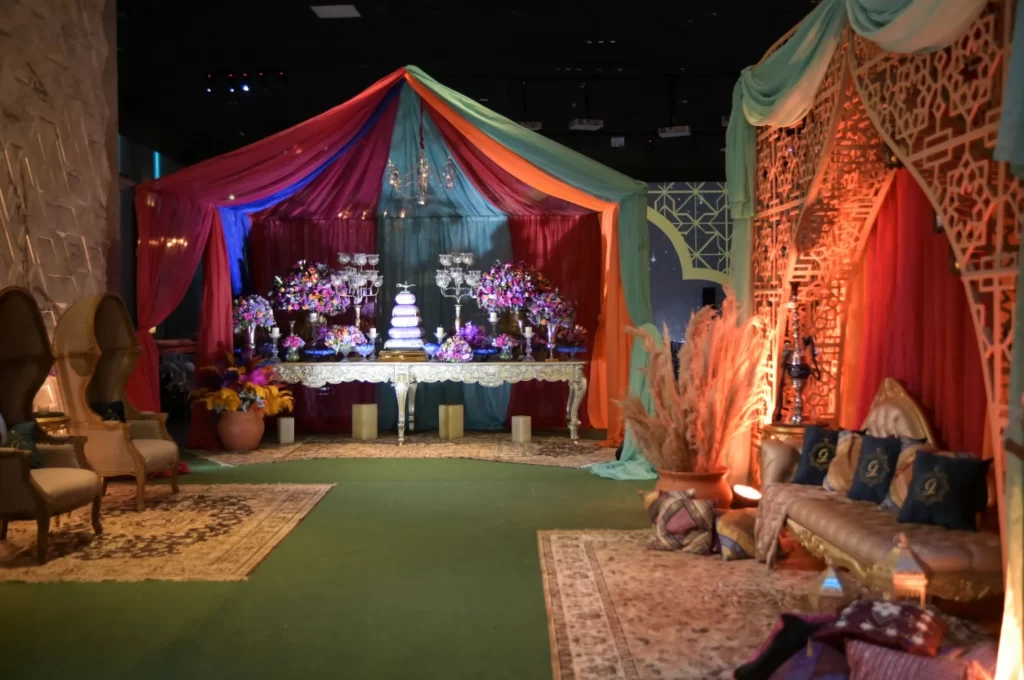 A iluminação é um dos aspectos mais poderosos da decoração, capaz de transformar completamente um espaço. Luzes quentes e difusas criam uma atmosfera íntima e acolhedora, enquanto luzes coloridas e dinâmicas podem adicionar energia e movimento ao ambiente. A iluminação cenográfica, como spots direcionados e projeções, pode ser usada para destacar elementos específicos da decoração, como mesas de buffet ou áreas de fotos.