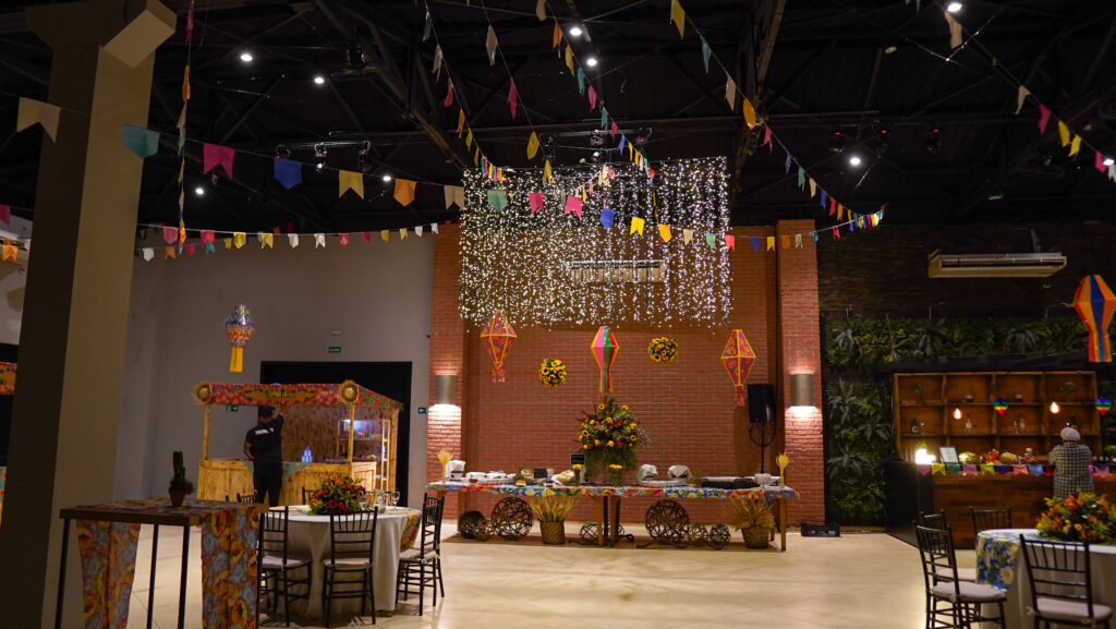 A ambiência é fundamental para transportar os participantes para um cenário genuíno de festa junina. Bandeirinhas coloridas, iluminação estratégica, barraquinhas temáticas e elementos rústicos criam uma narrativa visual envolvente.